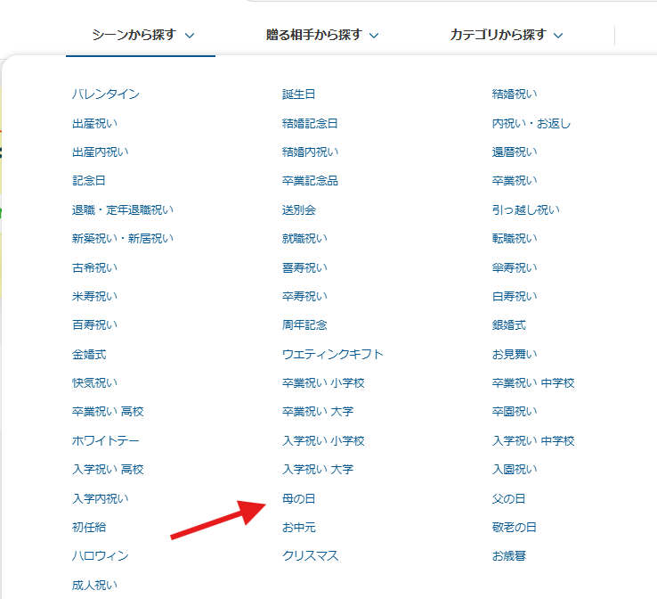 サイトのトップページ「シーンから探す」から「母の日」を選択すると……