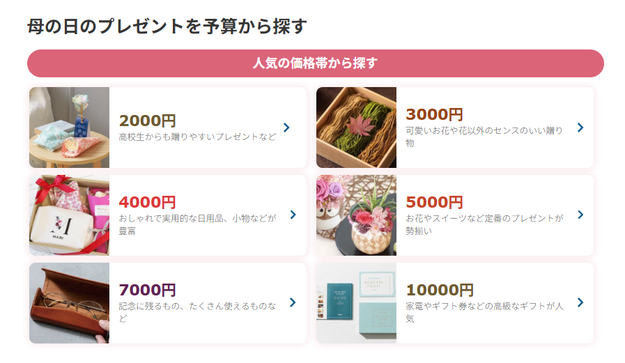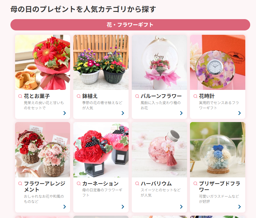 母の日ギフトはもちろん、誕生日や結婚祝い、新築祝いなど、シチュエーションに合わせたギフトが多くラインナップされています。